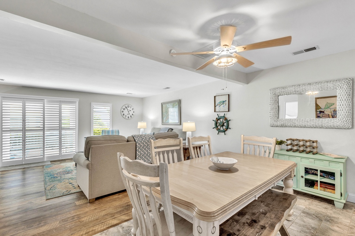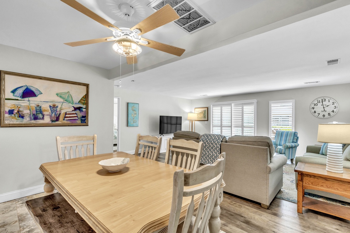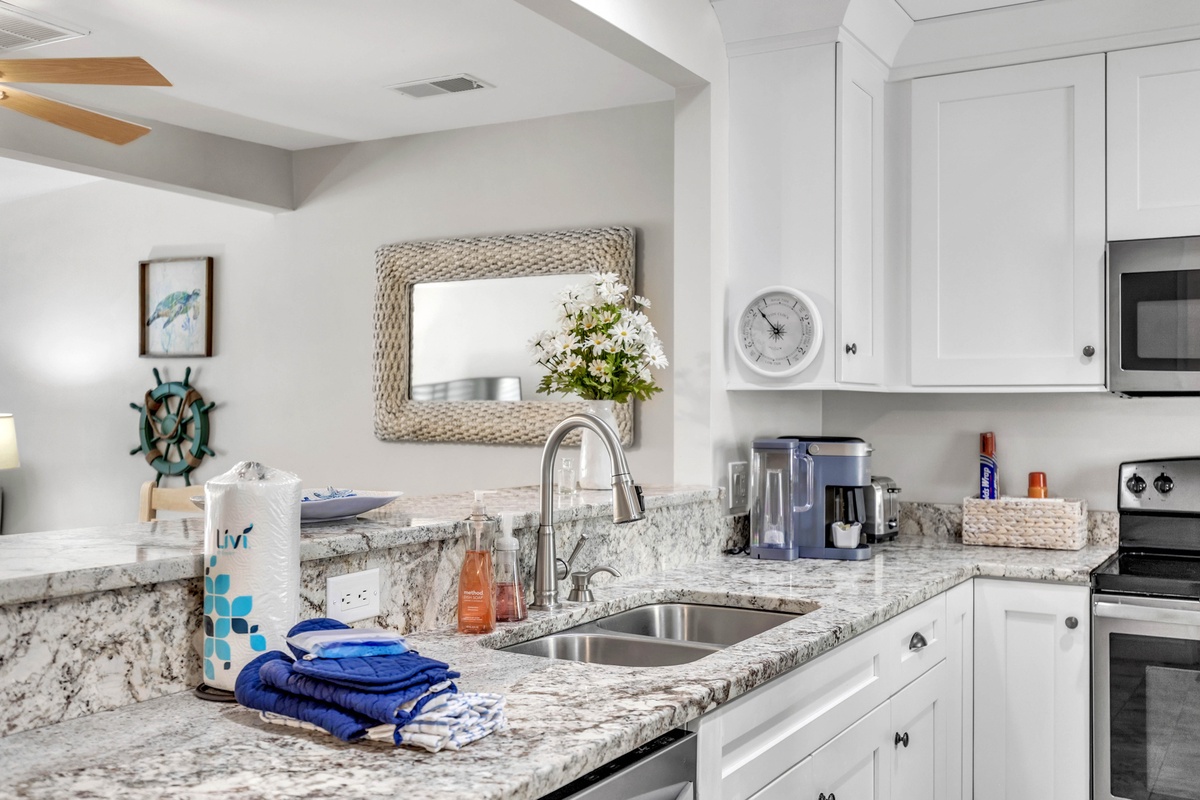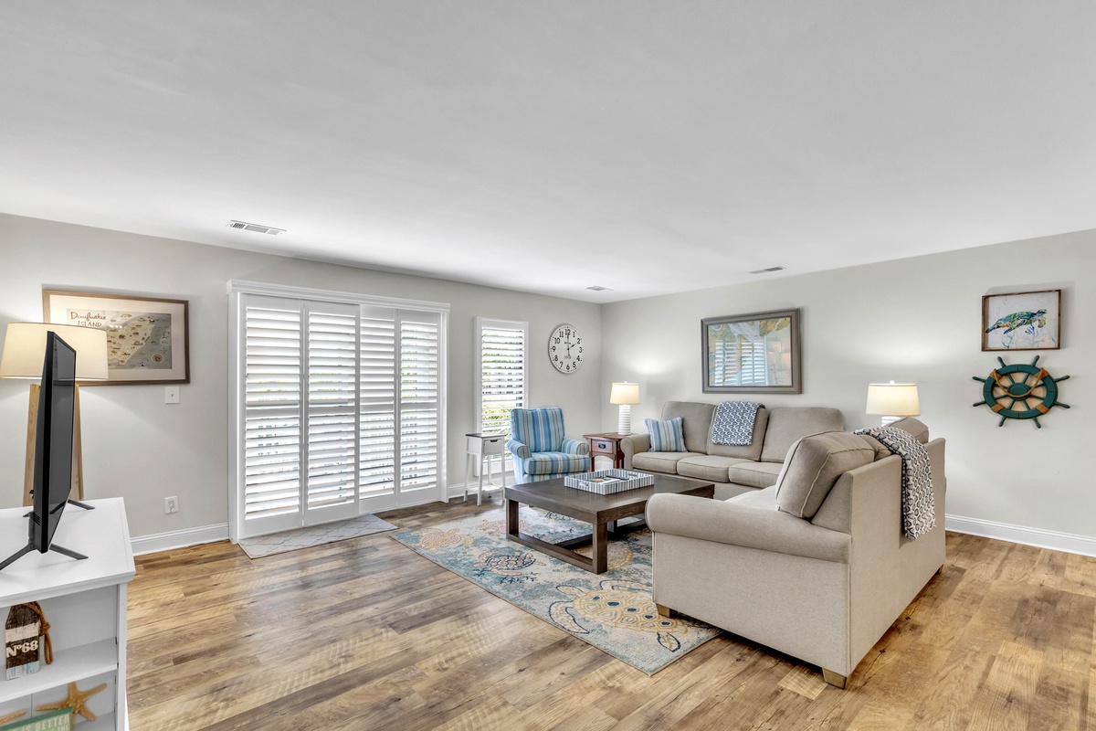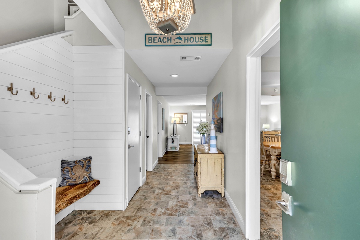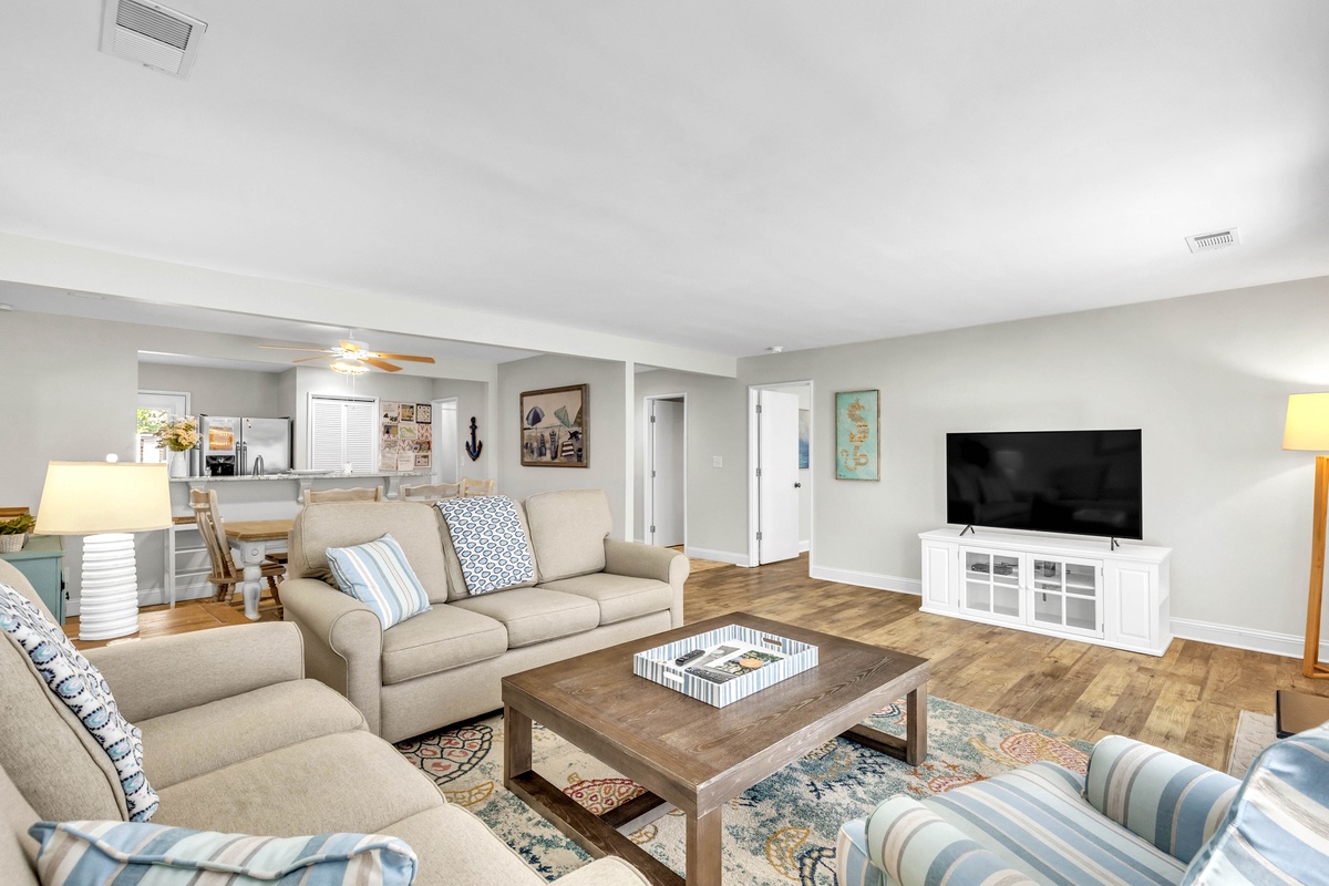 1900 square feet of living space provides plenty of room for up to 7 guests. A lovely 2-story entry sets the tone for the main level open floor plan that includes a living area with cozy oversized furnishings, 65" Smart TV and sliding doors to the deck, a dining area with seating, and a fully-equipped kitchen with stainless steel appliances, granite counter tops, a Keurig, and your cooking essentials. The kitchen also features a stackable washer and dryer and access to the storage yard which includes an outdoor shower, perfect for rinsing off after the beach! The enclosed deck includes a patio table with seating and grill, perfect for dining outdoors!