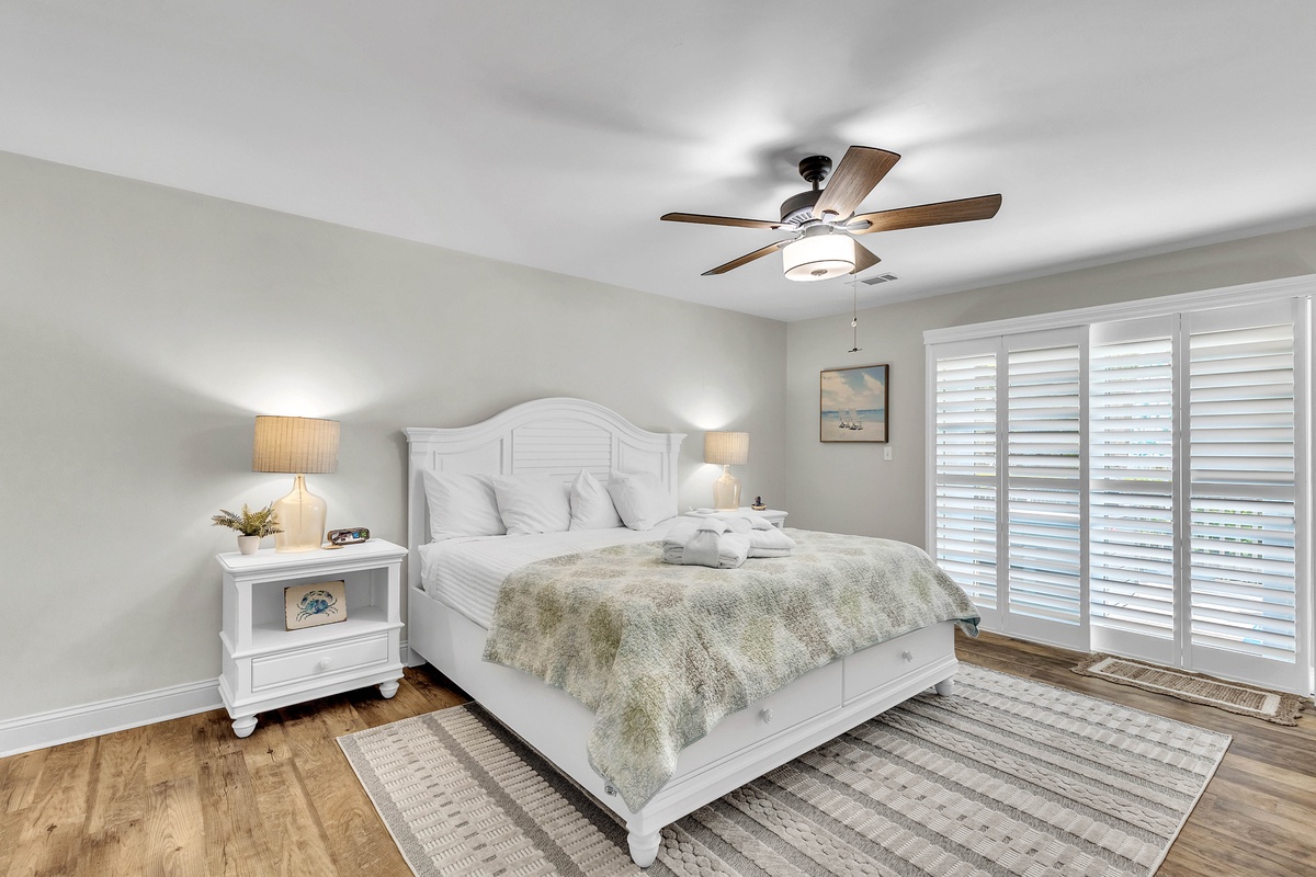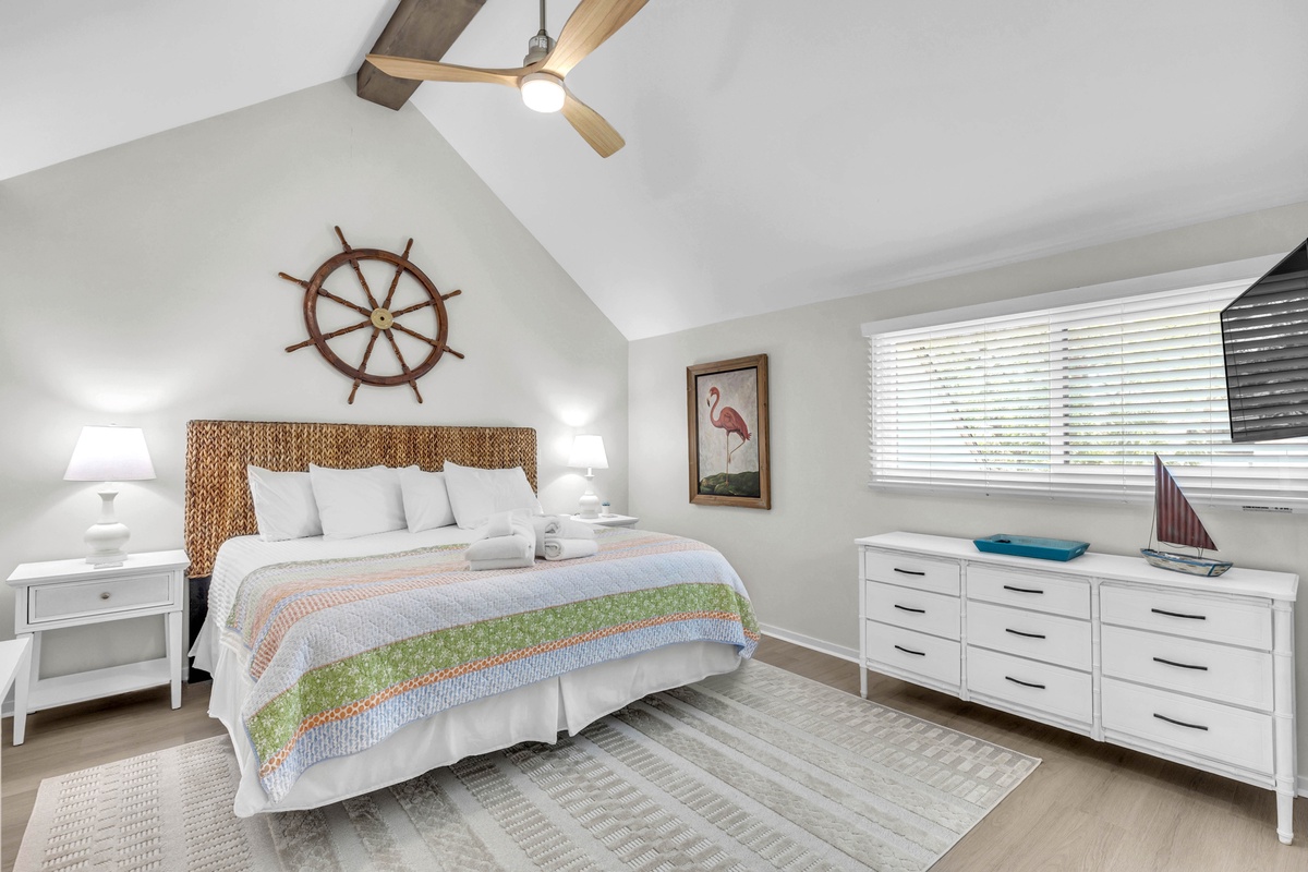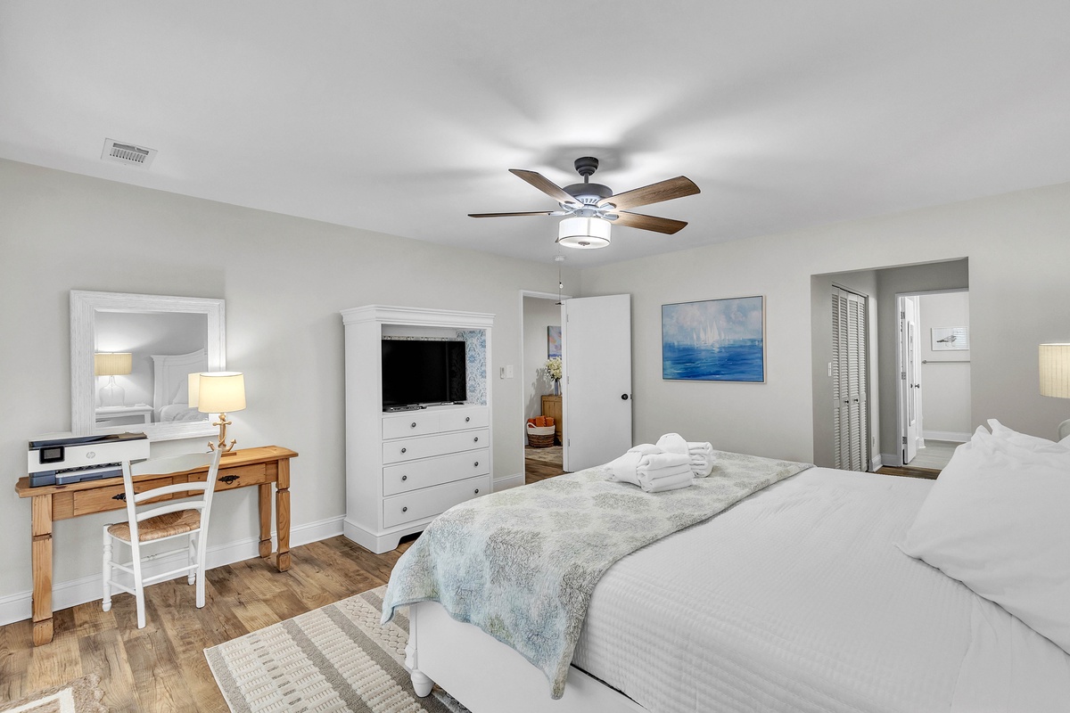 Also on the main level is the owners suite featuring a KING size bed, Smart TV, his and hers closets, a full en suite bath, and access to the deck.