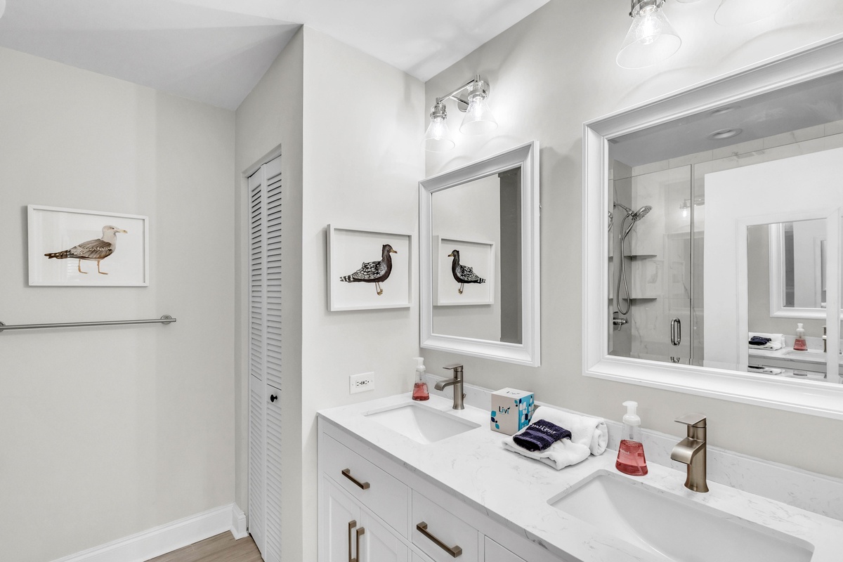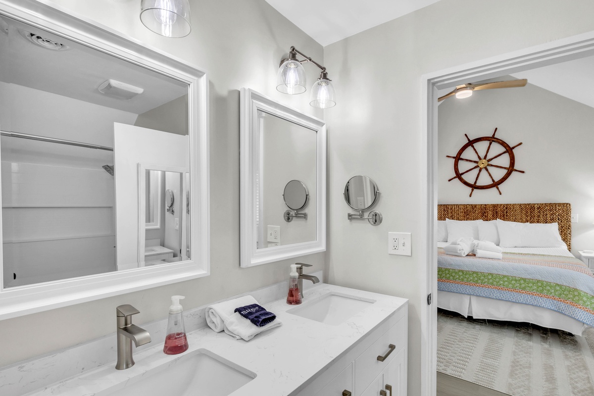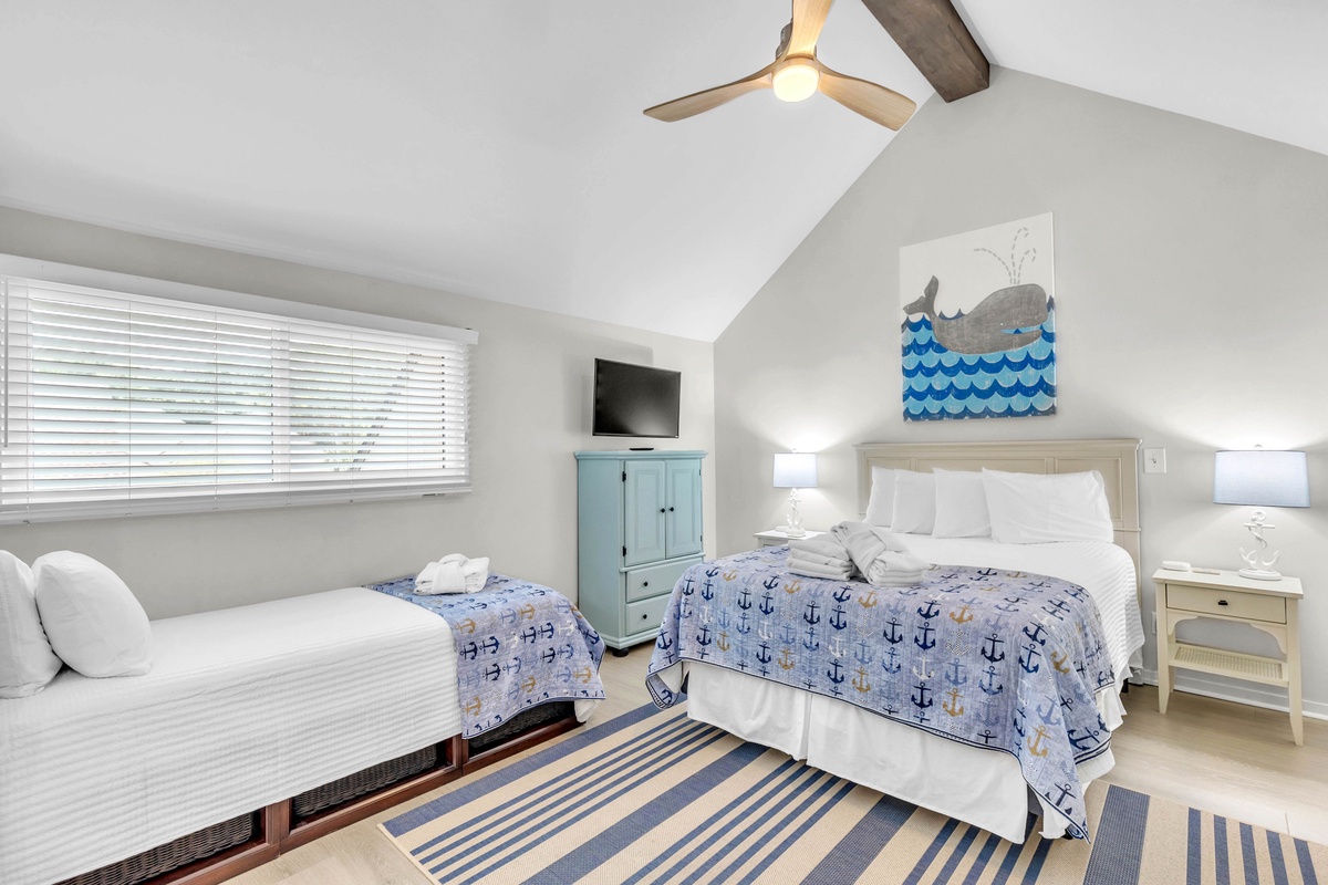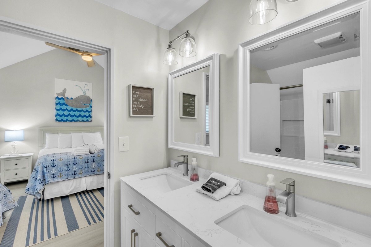 Two lovely guest bedrooms are located upstairs and share a Jack N Jill bath - each with their own Smart TV. One bedroom offers 1 Queen Bed and 1 Twin bed and the other has a KING bed.