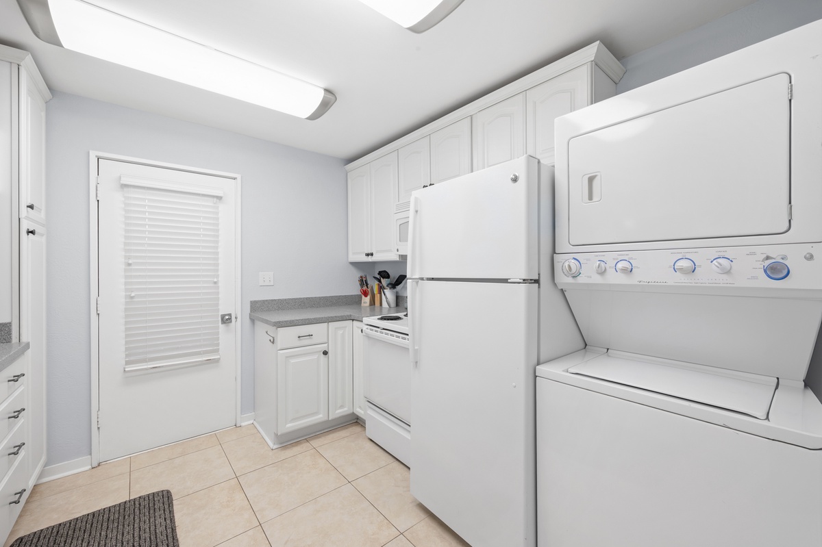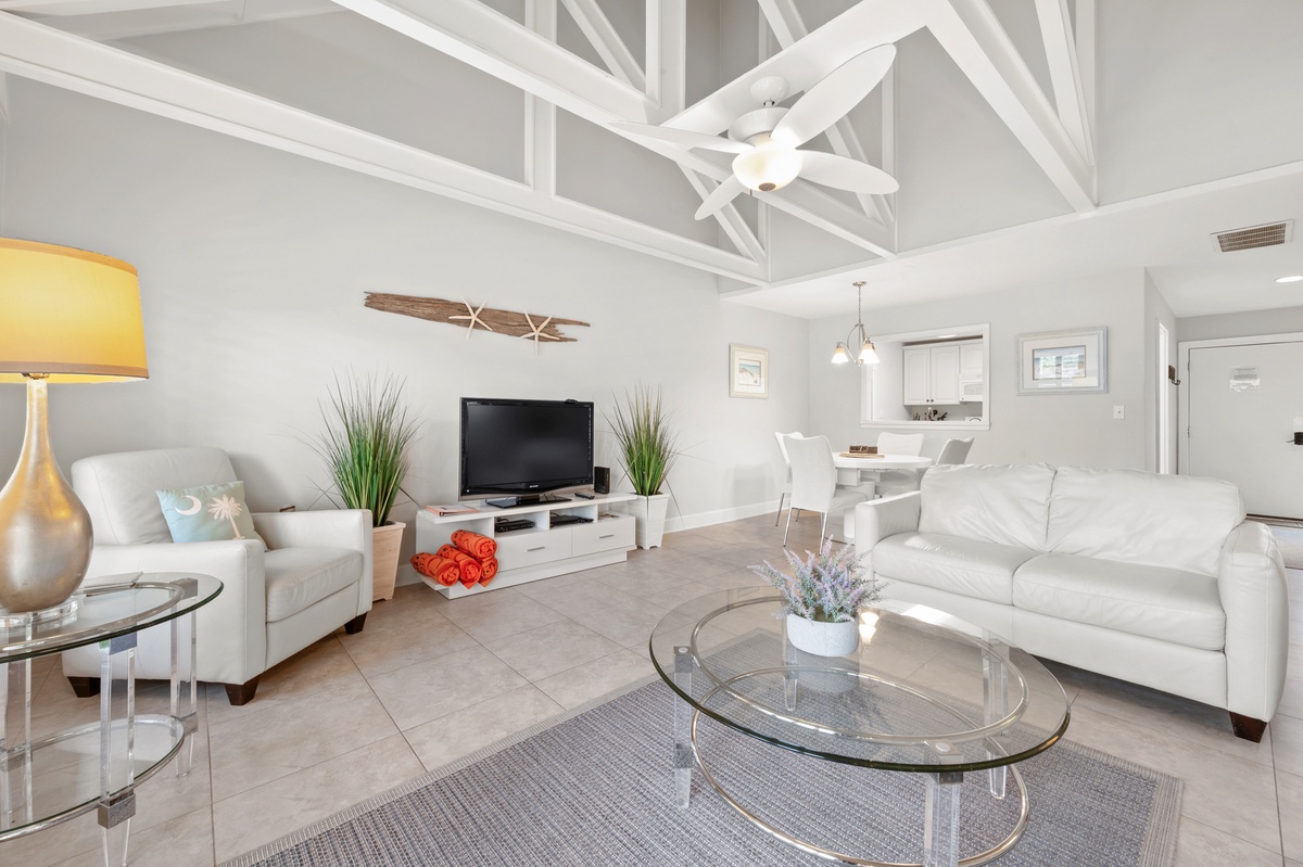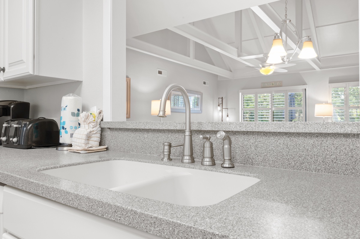 Inside, the open-concept layout makes relaxing and entertaining feel effortless throughout the living, dining, and kitchen spaces. The updated kitchen features granite countertops, stainless steel appliances, and everything needed to enjoy meals at home. The villa comfortably sleeps four with two spacious bedrooms and two full bathrooms, ideal for couples or small families. The primary suite offers direct patio access, perfect for quiet mornings or unwinding at the end of the day.