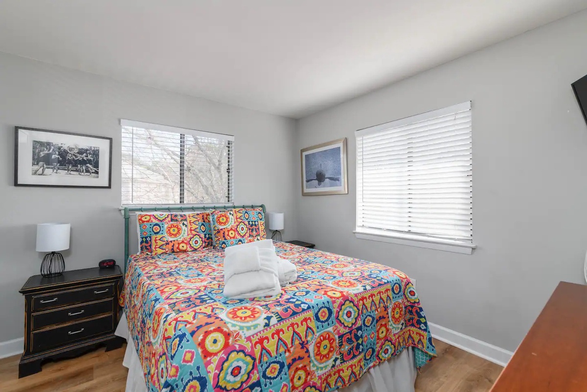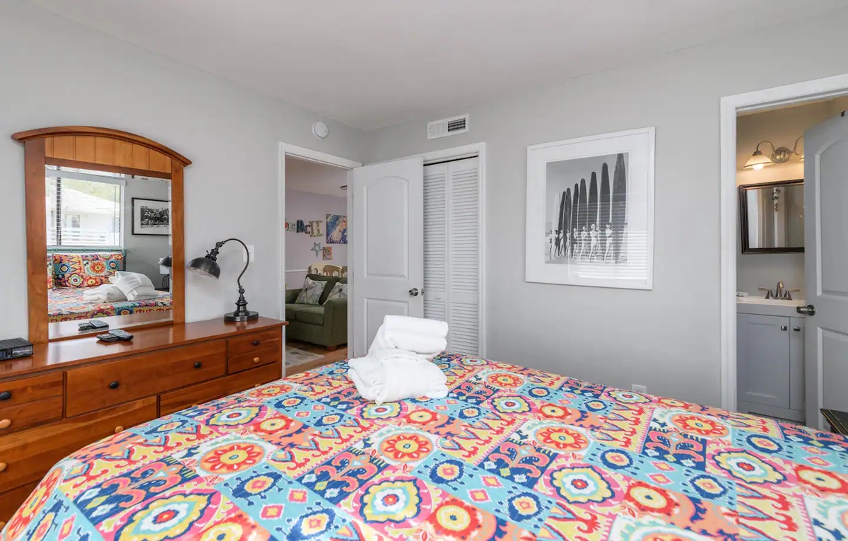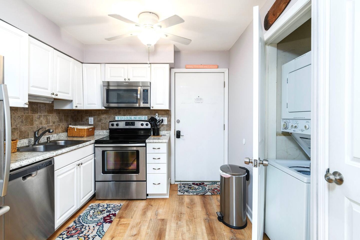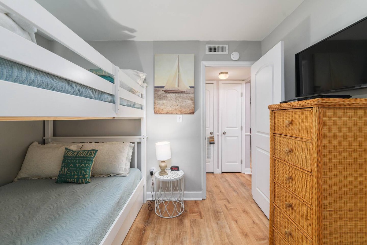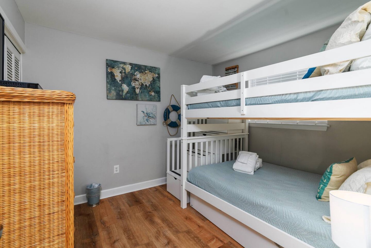 Accommodating up to 6 guests, this villa boasts a queen bed in the main bedroom, full over full bunks in the 2nd bedroom, and a pull-out sofa in the living room. Located on the top floor, you'll enjoy peace and privacy during your stay, with the convenience of a washer and dryer provided in the villa.