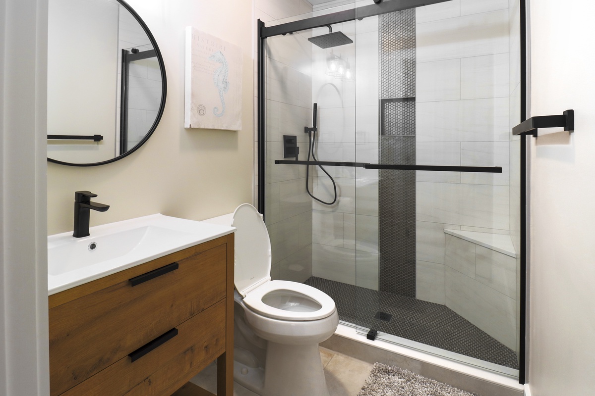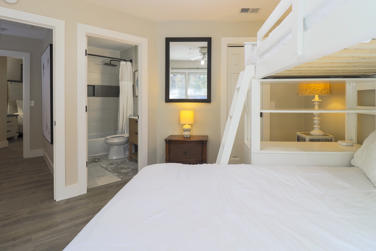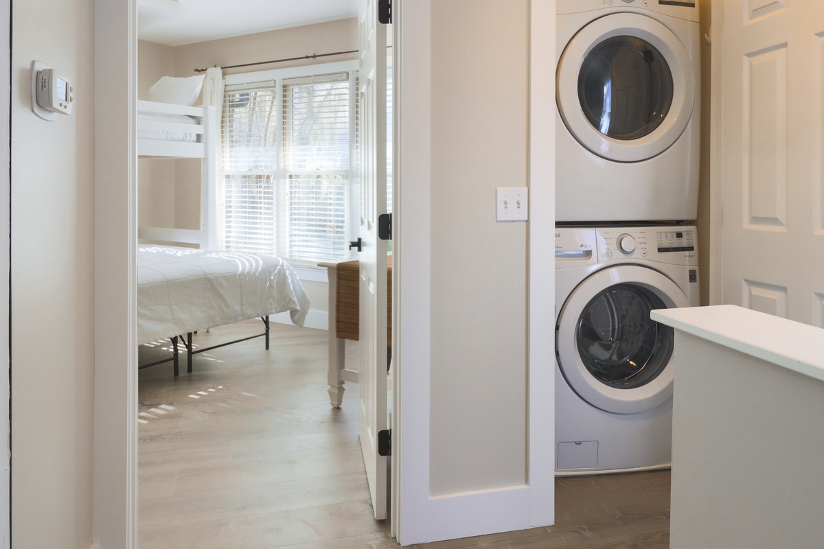 The first floor provides a great living area perfect for movie or game night, or just kicking back with a good book. The fully-equipped kitchen is perfect for fixing everything from morning coffee to a gourmet meal to enjoy in the dining area or on your private deck. The bedrooms are located upstairs and have their own private bathrooms. The primary bedroom has a queen-sized bed and the guest bedroom has twin beds. A laundry closet is conveniently located on the second floor, too.