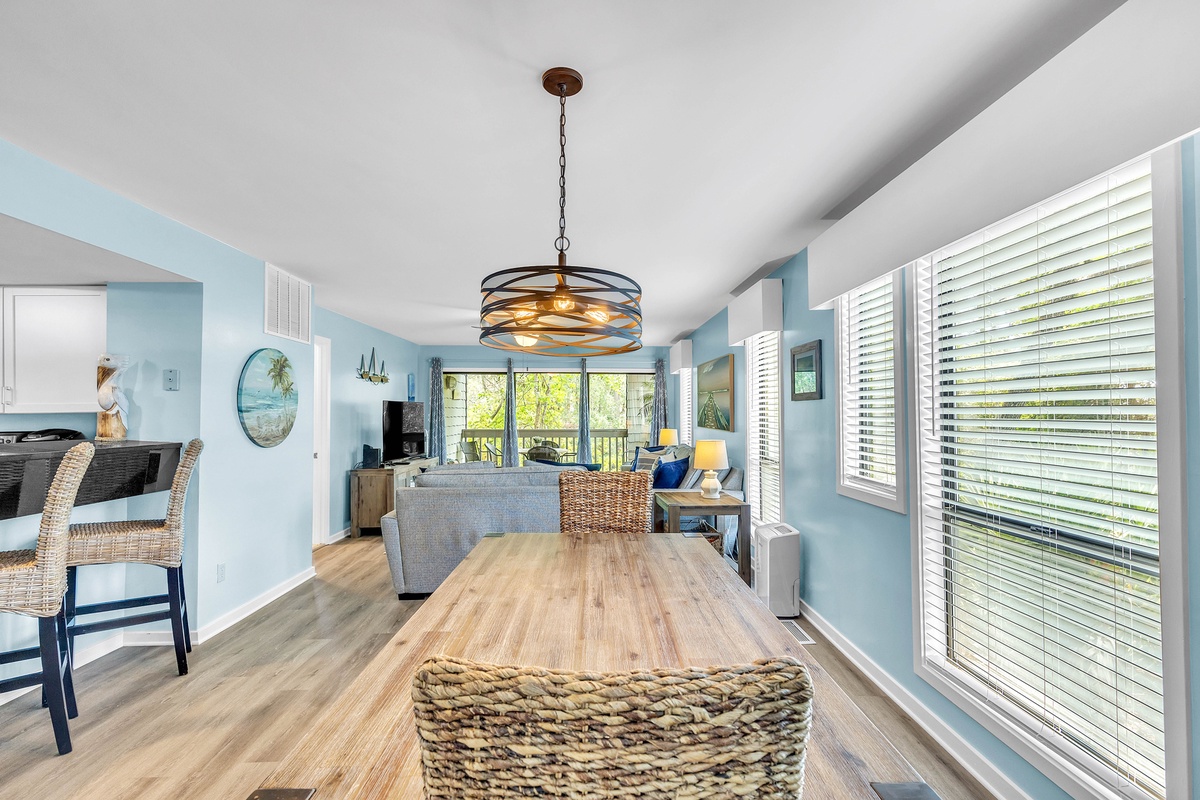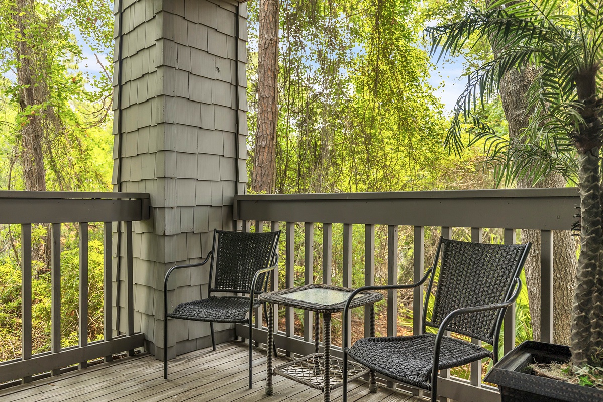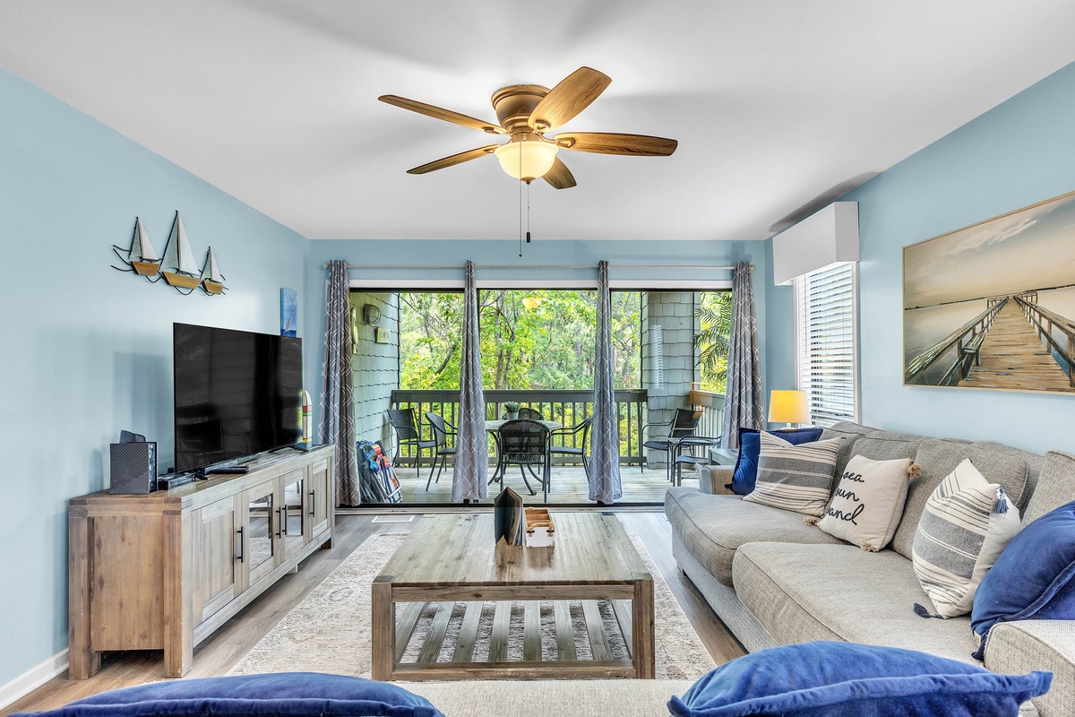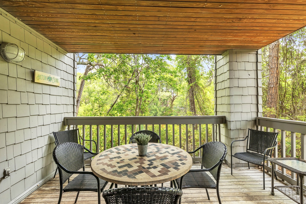 Welcome to 7827 Centre Court in the heart of Palmetto Dunes! This updated and pet-friendly (for an additional charge) 2BR/2BA villa is steps from the community pool and has easy access to the beach, tennis, golf, and all that Palmetto Dunes has to offer! The kitchen is fully equipped and features brand-new stainless-steel appliances, granite countertops, and bar seating for two. The dining area comfortably seats six. The living room has comfy seating and is perfect for cuddling up with popcorn for a movie night on the large flatscreen TV. Just off the living area, you can access the private deck, which overlooks Palmetto Dunes' 11-mile lagoon system. The bedrooms are situated on opposite ends of the villa. Both are equipped with 2 queen-sized beds and a television, and each has its own en-suite bathroom.