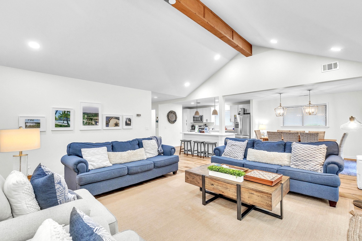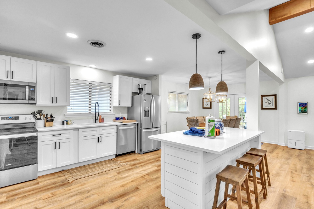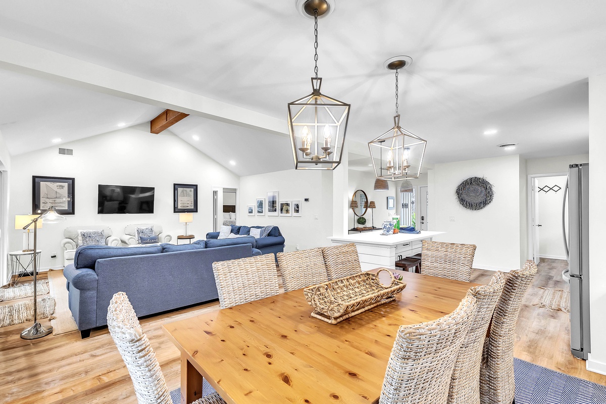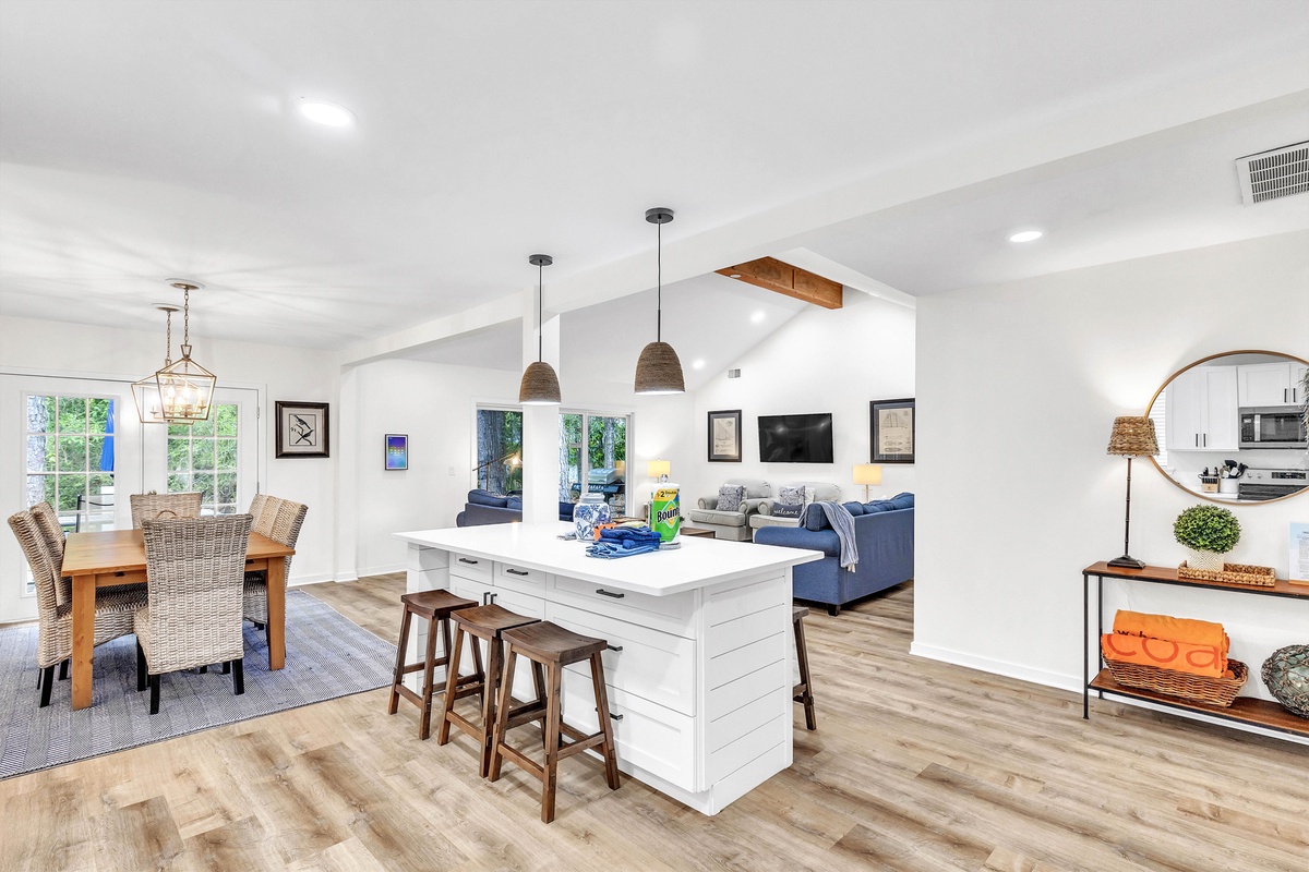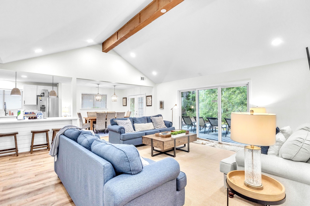 Enjoy indoor activities such as family movie or game nights (we will supply the popcorn) in the spacious living room with sliders to the deck. The fully equipped kitchen is the perfect place to pack a picnic basket for the beach or prepare an exquisite meal to enjoy at the dining table. There are three bedrooms ideal for afternoon naps or a restful night of sleep.