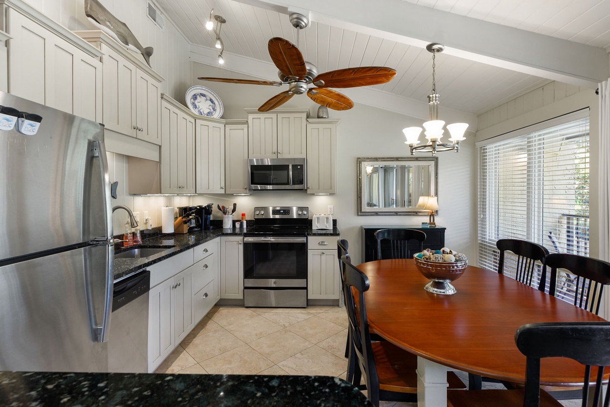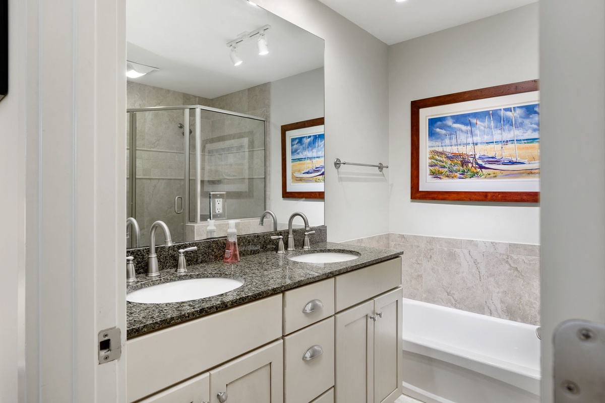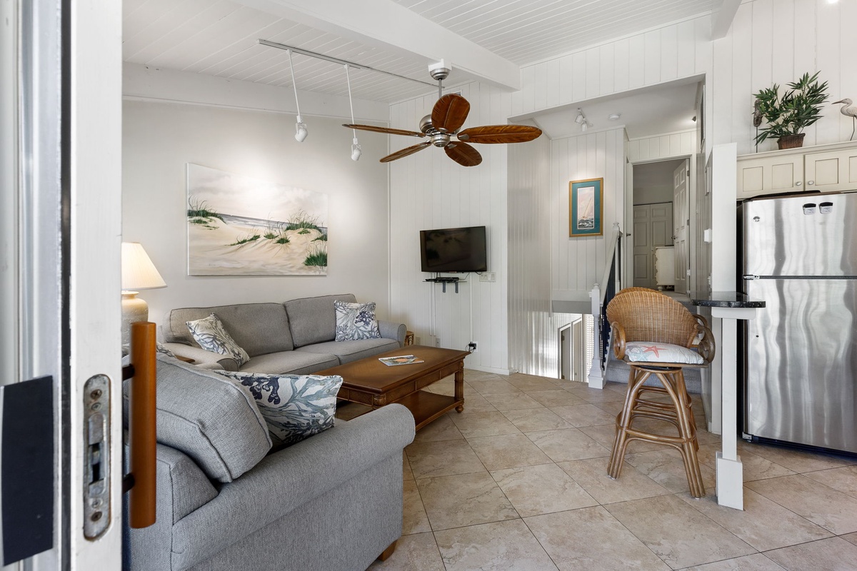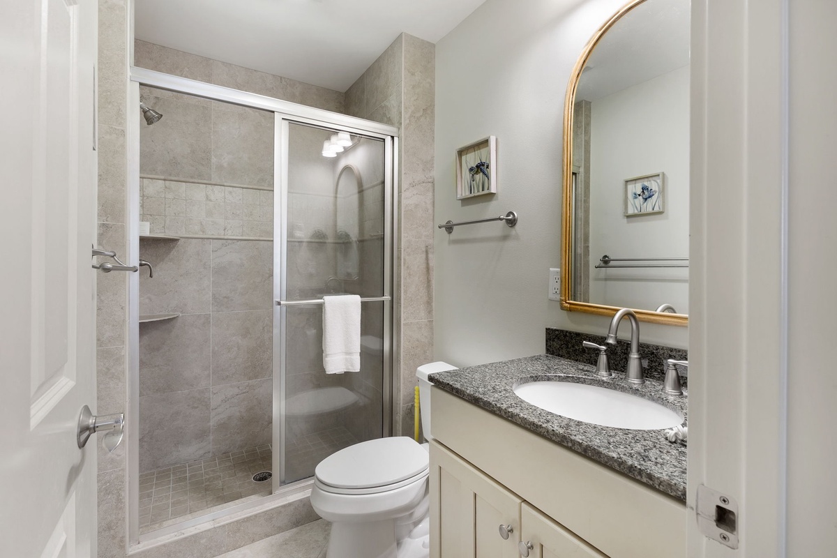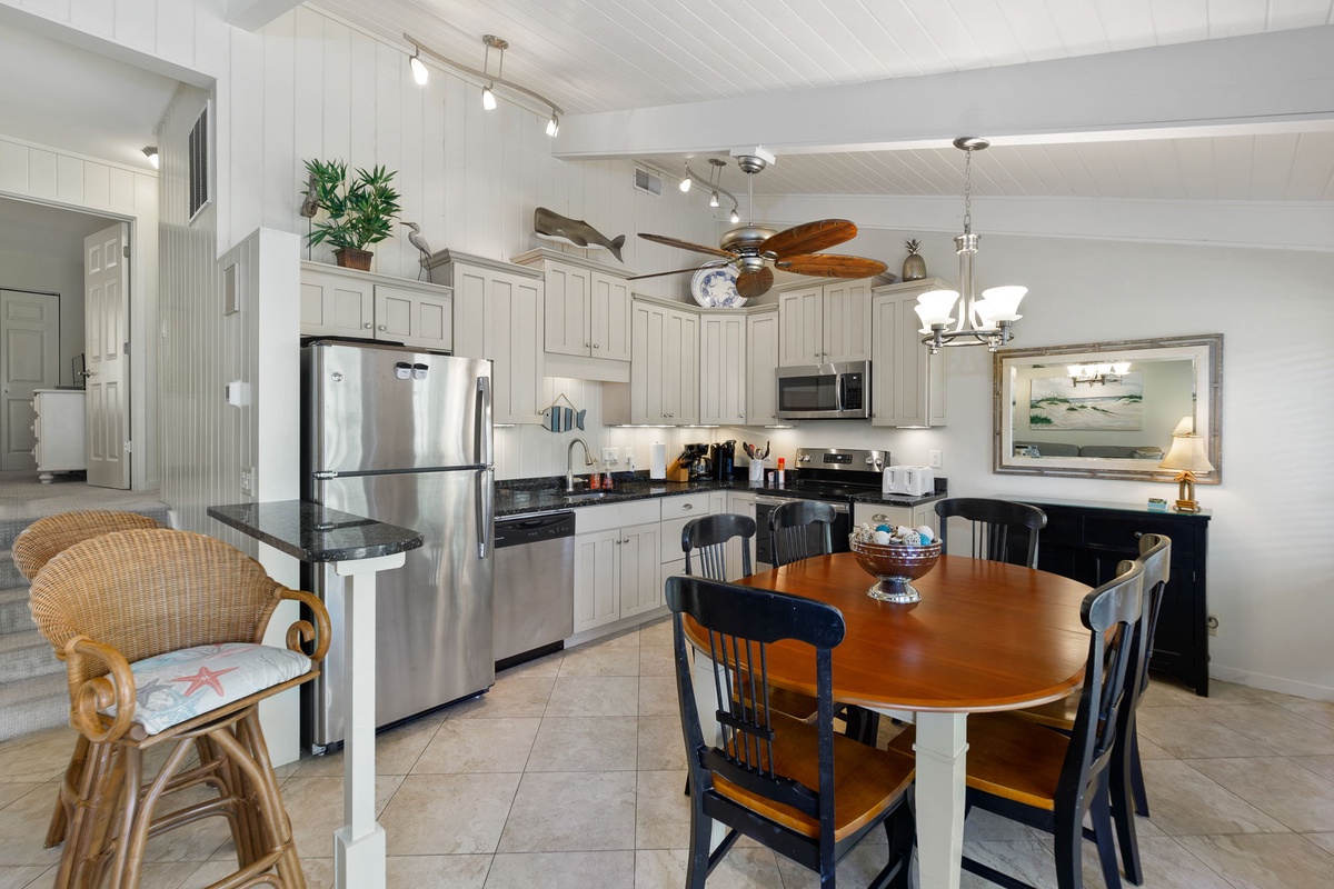 On the first level, the twin bedroom has a flatscreen TV, patio access, and access to the bathroom in the upper foyer hall that features a walk-in shower. The second level of the villa is the main floor which offers an open kitchen, newly furnished living and dining areas with a slider door leading to the deck off the kitchen. The living room has a wall-mounted flatscreen TV. The kitchen, with granite countertops, new stainless appliances, tile flooring, and modern cabinetry has every you need to get your chef on beach-style! The two primary bedrooms are on the third level. Both are furnished with flatscreen TVs and private bathrooms with walk-in showers.