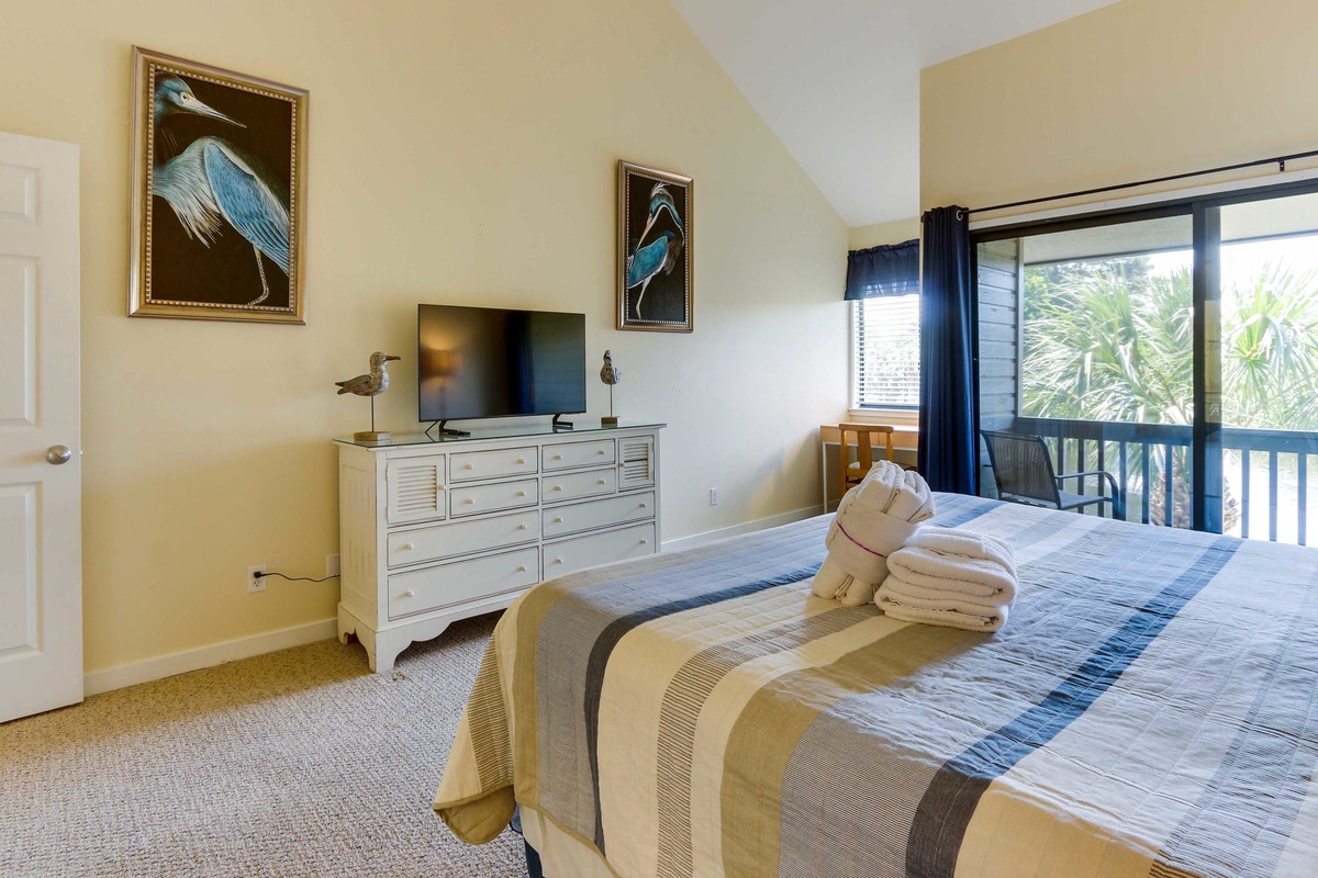 Are you looking for an ideal vacation spot? Then, you'll love this 3-bedroom and 3-bathroom villa at 919 Inverness Village, located in Palmetto Dunes Resort. This villa is perfect for families, as it features a second-level master bedroom with a king-sized bed and its own en-suite bathroom, a first-level guest bedroom with a queen-sized bed and en-suite bathroom, and a third bedroom with a full-sized bed and a twin bunk bed. Additionally, there is a sleeper sofa in the living room for extra guests. With a total living area of 2010 square feet, this villa offers plenty of space for rest and relaxation, especially from the lovely balcony off the living room, which has a peaceful water view - perfect for relaxing or family fun.