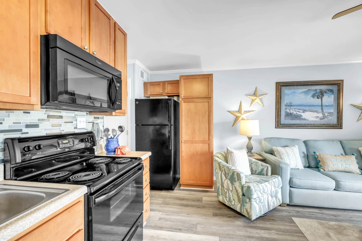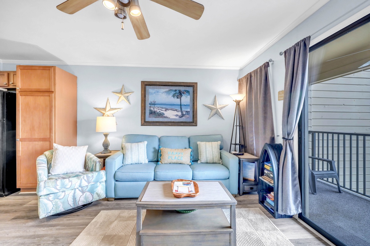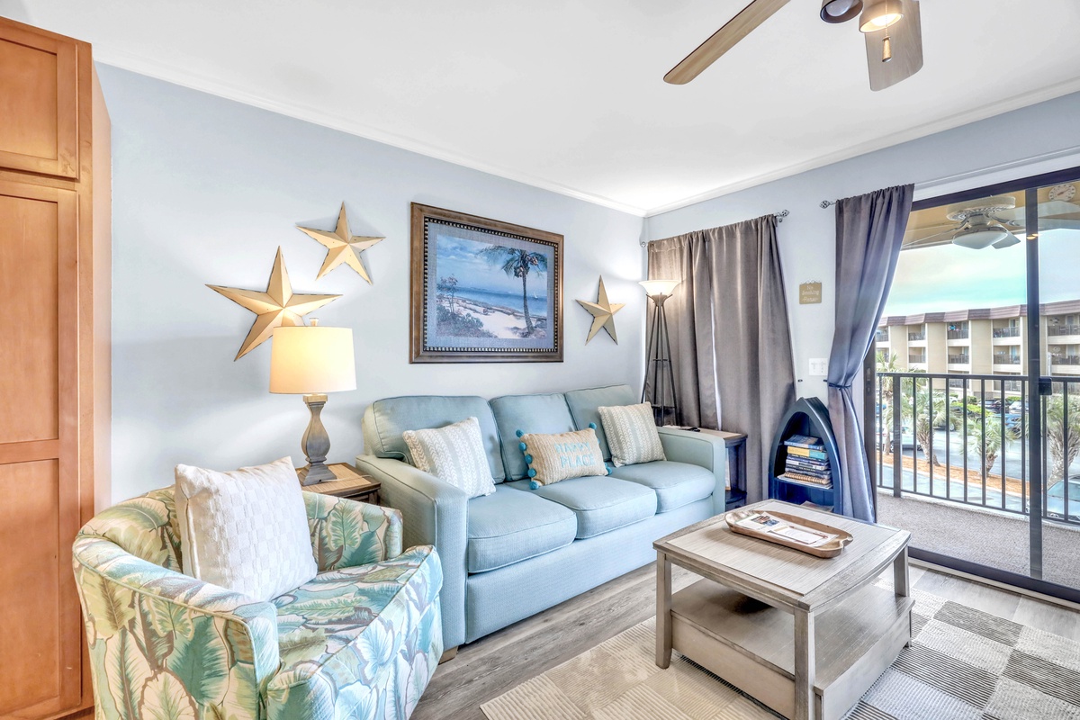 Inside, the bright and beach-themed interior welcomes you with an open layout perfect for group gatherings after each day's adventures. Step onto your private balcony, ideal for savoring morning coffee or evening cocktails against a backdrop of sea breezes. The full kitchen is well-equipped for at-home cooking, complete with all major appliances, including a dishwasher for effortless cleanup. In the evenings, unwind in the living room while streaming your favorite shows and movies on the smart TV. Enjoy modern comforts like free WiFi and central air-conditioning, with shared laundry facilities available for added convenience.