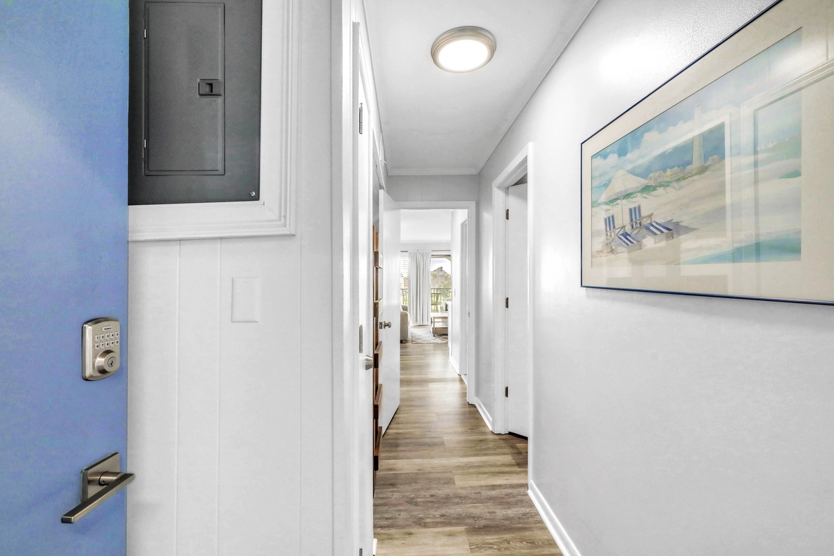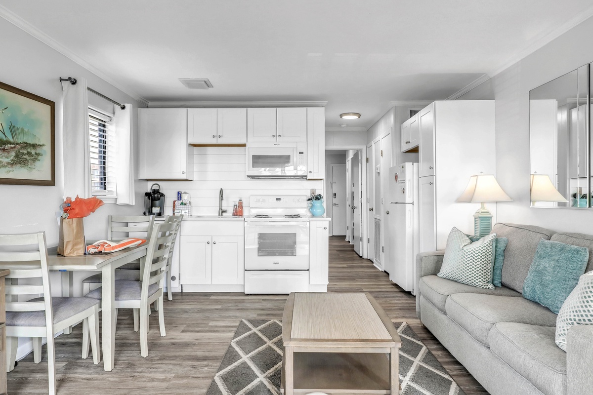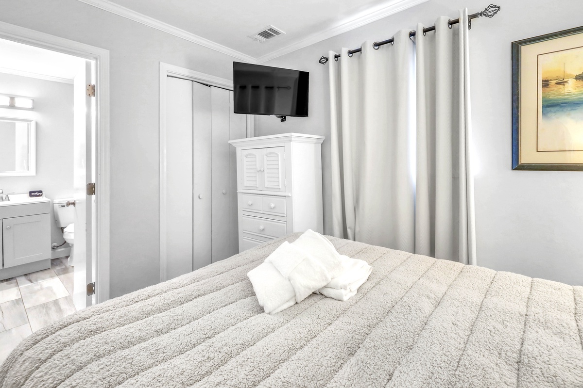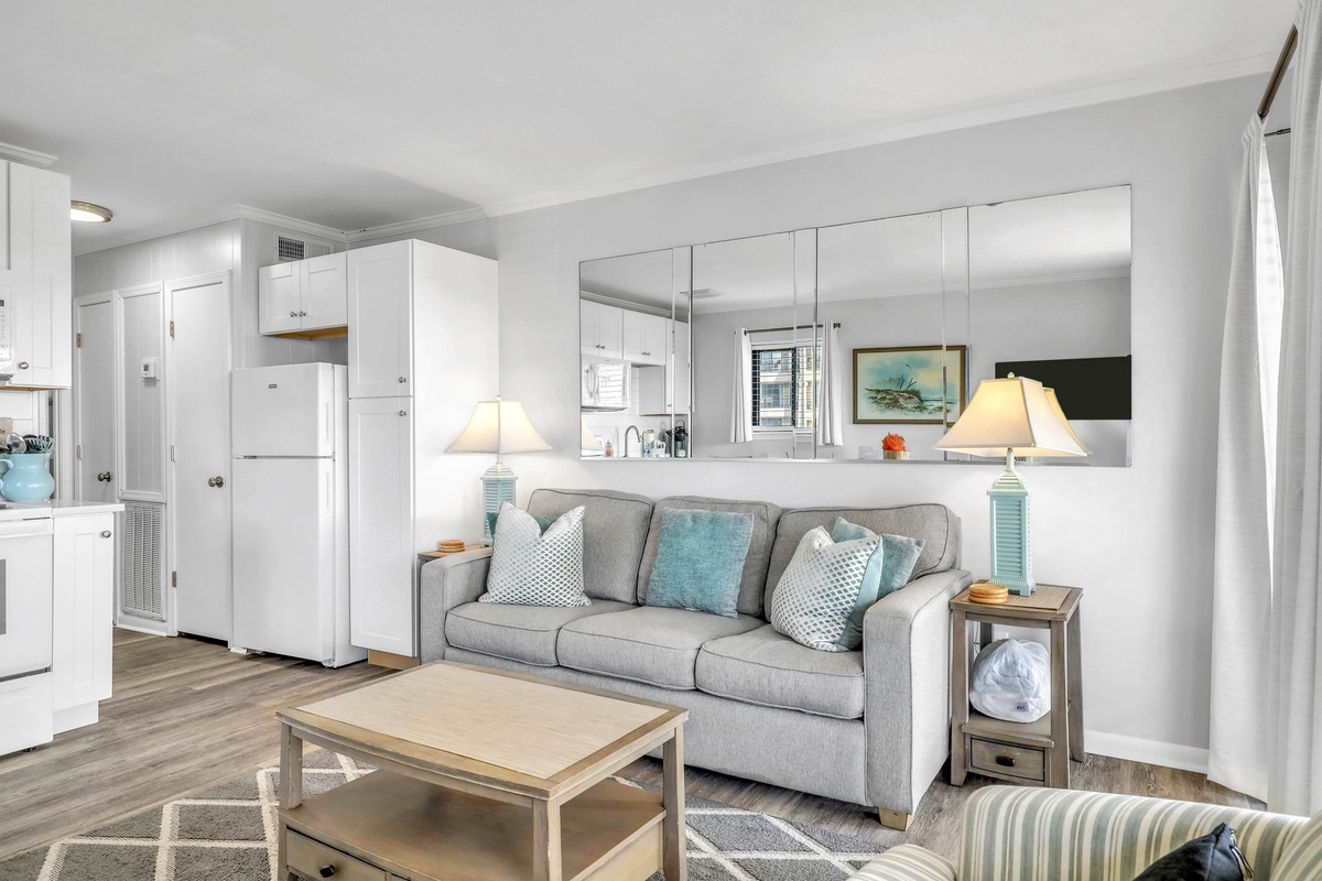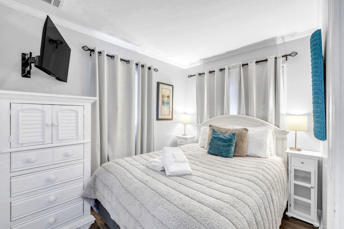 Step inside your sunny sanctuary, boasting a welcoming one-bedroom layout, perfect for unwinding after a day of coastal adventures. The private balcony beckons for leisurely mornings with coffee in hand or sunset soirées with your favorite cocktails. Whip up delectable meals in the fully equipped kitchen, with modern appliances for effortless culinary creations and a dishwasher for hassle-free cleanup. As night falls, sink into relaxation in the cozy living room, where a smart TV promises endless entertainment. Plus, stay connected with complimentary WiFi and stay cool with central air-conditioning.