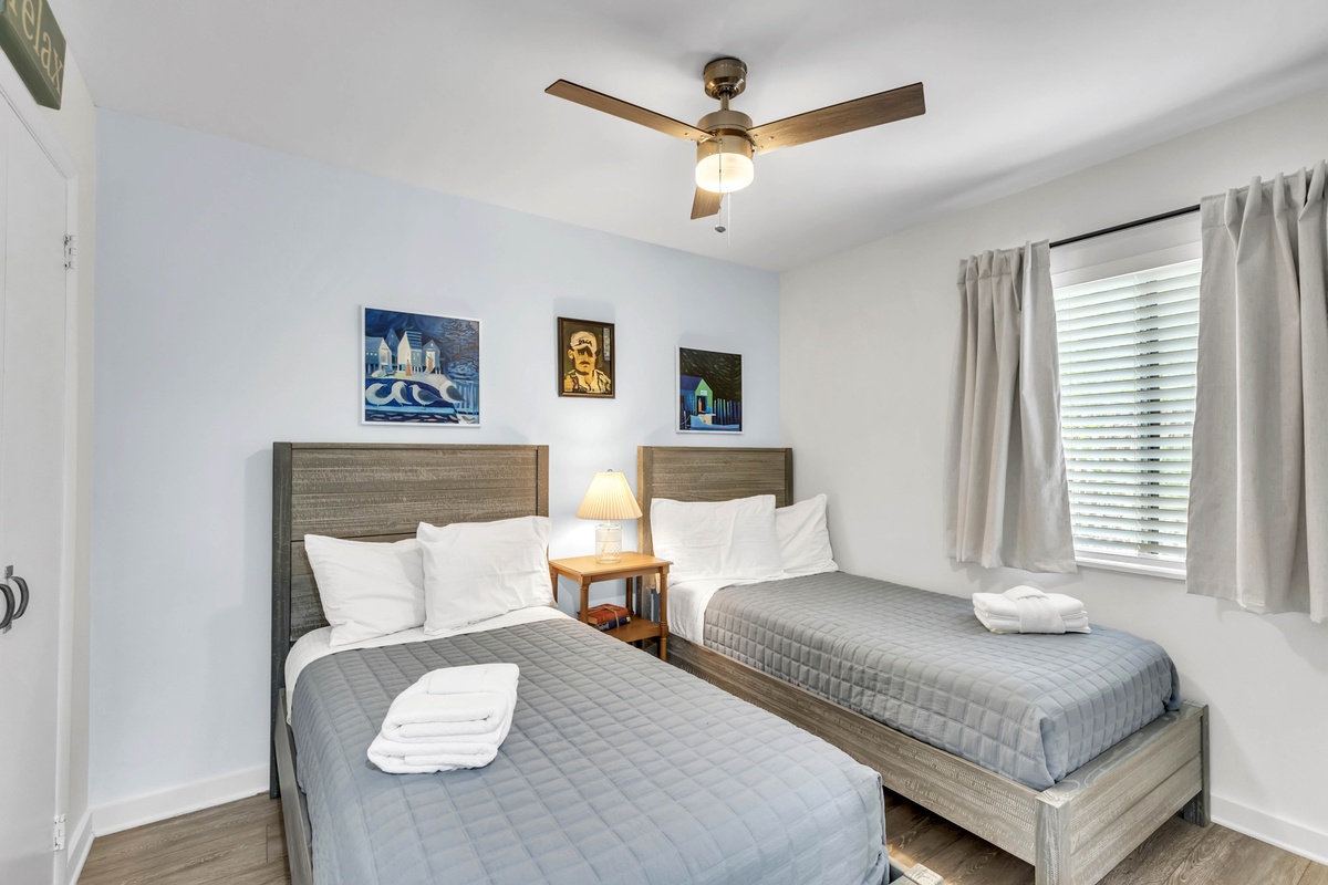 Relax in the open and inviting living space, featuring Smart TVs, board games, and a cozy atmosphere to unwind after a day of exploration. Prepare meals in the fully equipped kitchen with a Keurig coffee maker, blender, and stainless appliances, or step out onto the covered patio with seating and an electric grill for al fresco dining. This villa comfortably accommodates up to six guests, with a queen bed in the primary bedroom, two twin beds in the second bedroom, and a sleeper sofa in the living room. Additional comforts include in-unit laundry, complimentary WiFi, and beach gear, including chairs, an umbrella, and a wagon.